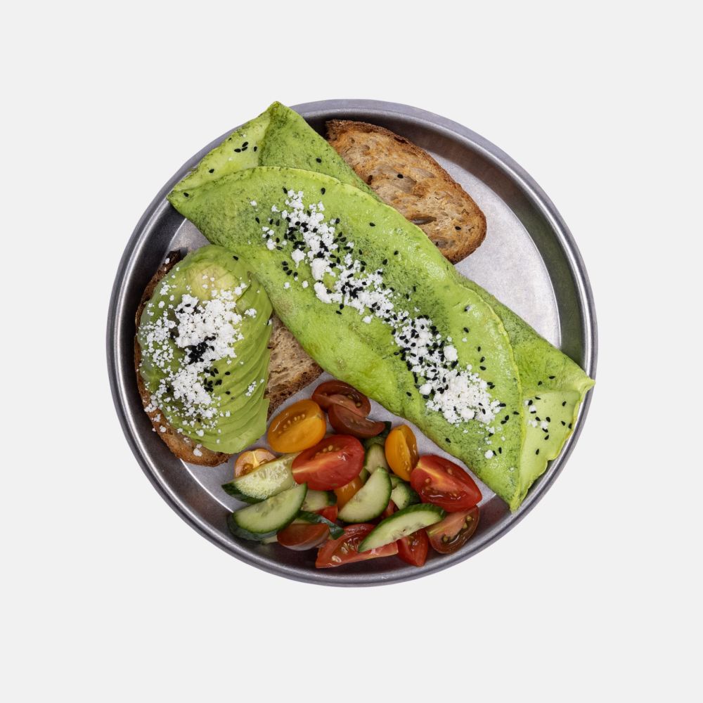 4 yumurta beyazı, taze fesleğen, dereotu, maydanoz, lor peyniri, dilim avokado, çörek otu, ekşi maya ekmek