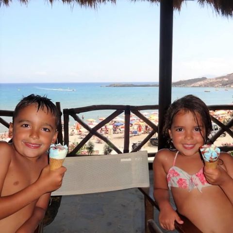 Paradise Beach’in denizi çarşaf gibi, berrak, ılık ve gayet cezbedici bir rengi var ama gel gör ki çok kalabalık. Upuzun kumsalda yanyana dizilmiş onlarca, belki yüzlerce şezlong hayal edin. Yine de bu denizi çok seviyor,keyifle yüzüyoruz. Çocuklar denizin ortasında kurulmuş su parkına bayılıyorlar. Sonrasında Paradise beach bar’a çıkıyor, biz frappelerimizi yudumlarken, kuzular dondurmalarını yalıyorlar.