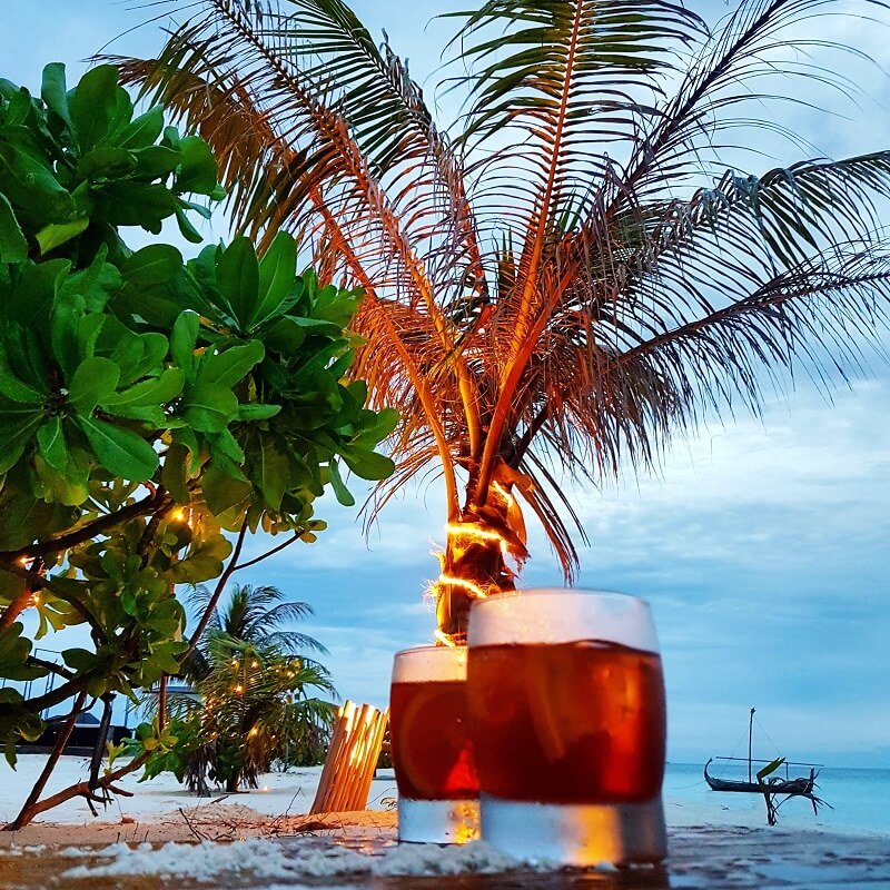 Ancak Müslüman halkın yaşamadığı tek bir resort otele ait adalarda alkollü içecek satışı mevcut, günbatımına karşı birer Negroni muhteşem oluyor.