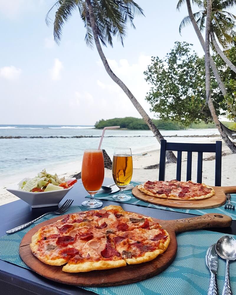Maldivler’de başkent Male’de ve Müslüman halkın yaşadığı yaklaşık 200 adada alkollü içecek satışı ve tüketimi yasak. Bu adalardaki otellerde dahi alkollü içecek servis edilemiyor. Bu nedenle fotoğraftaki yaz tatili öğlen yemeklerinin vazgeçilmezi çıtır pizzamıza alkolsüz bira ve papaya suyu eşlik ediyor.