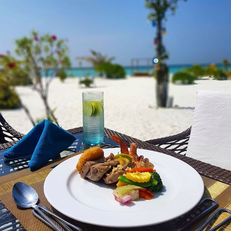 Maldivlerde her menüde rastlayacağınız ortak yemek TUNA STEAK (ton balığı dilimi). Hayvancılık normal olarak pek gelişmediği için kırmızı et yaygın değil, bu da “Deniz kenarında deniz ürünü yenir.” kafasındakiler için ideal bir durum oluşturuyor.