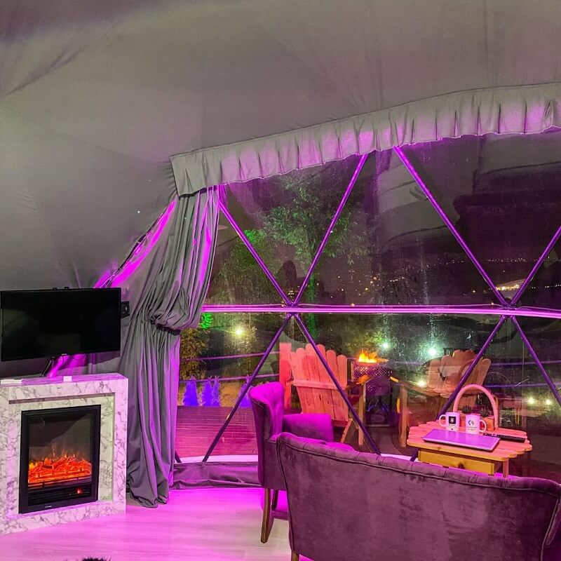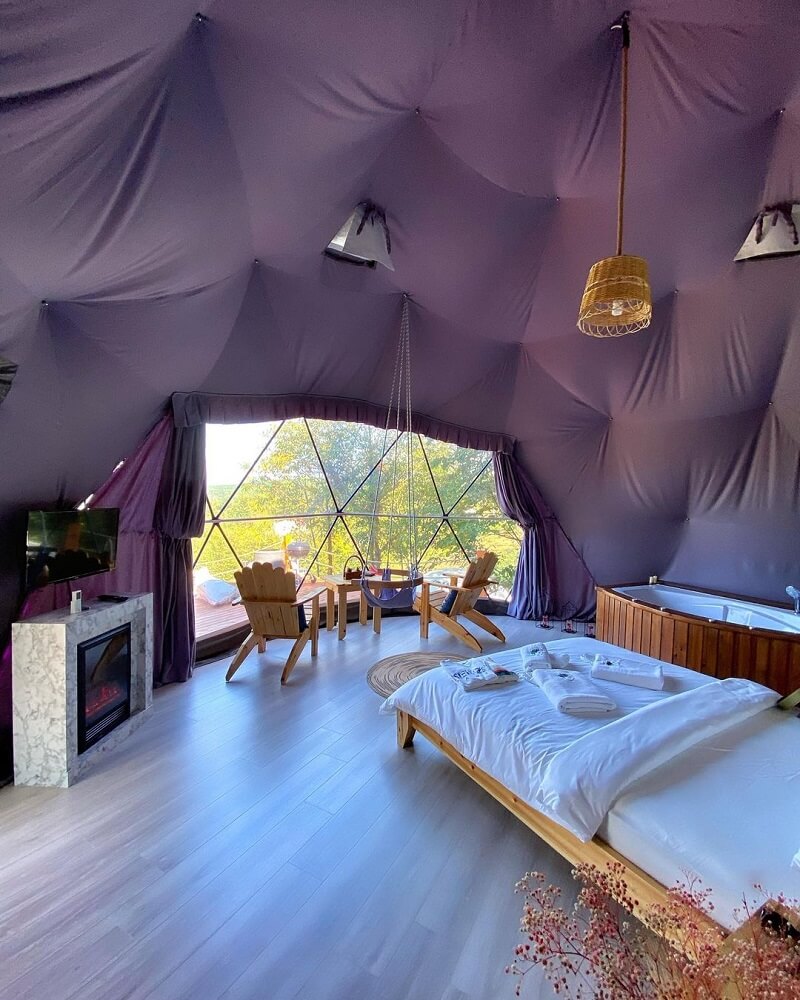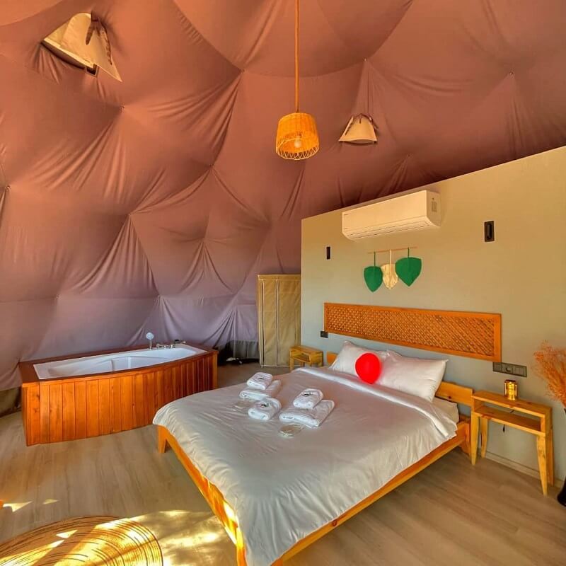 Mega Glamping çadırları benzerlerine göre oldukça büyük, her biri 40 metrekare olan dome kubbe çadırlar normalde 2 kişilik olarak tasarlanmış ama 3. kişi için yatak ilave edilebiliyor. Her çadırın önünde orman ve göl manzarasına nazır ateş yakma ve barbekü yapma imkanı da mevcut.