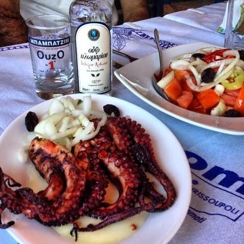 Denize gir çık gir çık karınlar acıkıyor. Etrafta restorandan ziyade plaj barı tadında şirin üç beş mekan var ama bizim aklımız ahtapotta kalamarda. 🙂 Henüz Thassos Adası’nda yiyeceğimiz en lezzetli deniz ürünlerini az sonra damaklarımızı şenlendireceğinin farkında değiliz. Kumsalın sol ucunda deniz ile iç içe bir restoran olan Pefkospilia Restaurant’ta lokum kıvamındaki ahtapotları, çıtır çıtır kalamarları, kızarmış kabakları mest modunda hüpletiyoruz.