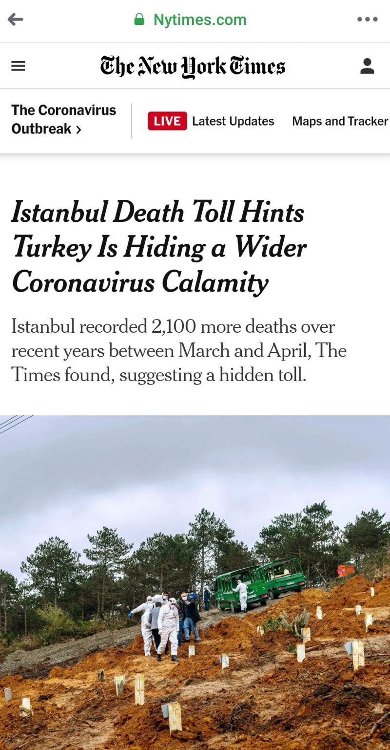 Haberde her ne kadar Türkiye koronavirüs sürecini yönetmek konusunda dünyanın en başarılı ülkelerinden biri olarak lanse edilse de son iki yılın haftalık ölüm ortalamaları baz alındığında İstanbul’da bu yıl Mart ile Nisan ayı arasında beklenen ölüm sayısının geçtiğimiz yıllara göre 2100 kişi daha fazla olduğu ve bu sayının yetkililerin o dönemde tüm Türkiye için açıkladığı corona virüsü ölümlerinden çok daha yüksek olduğu belirtildi.